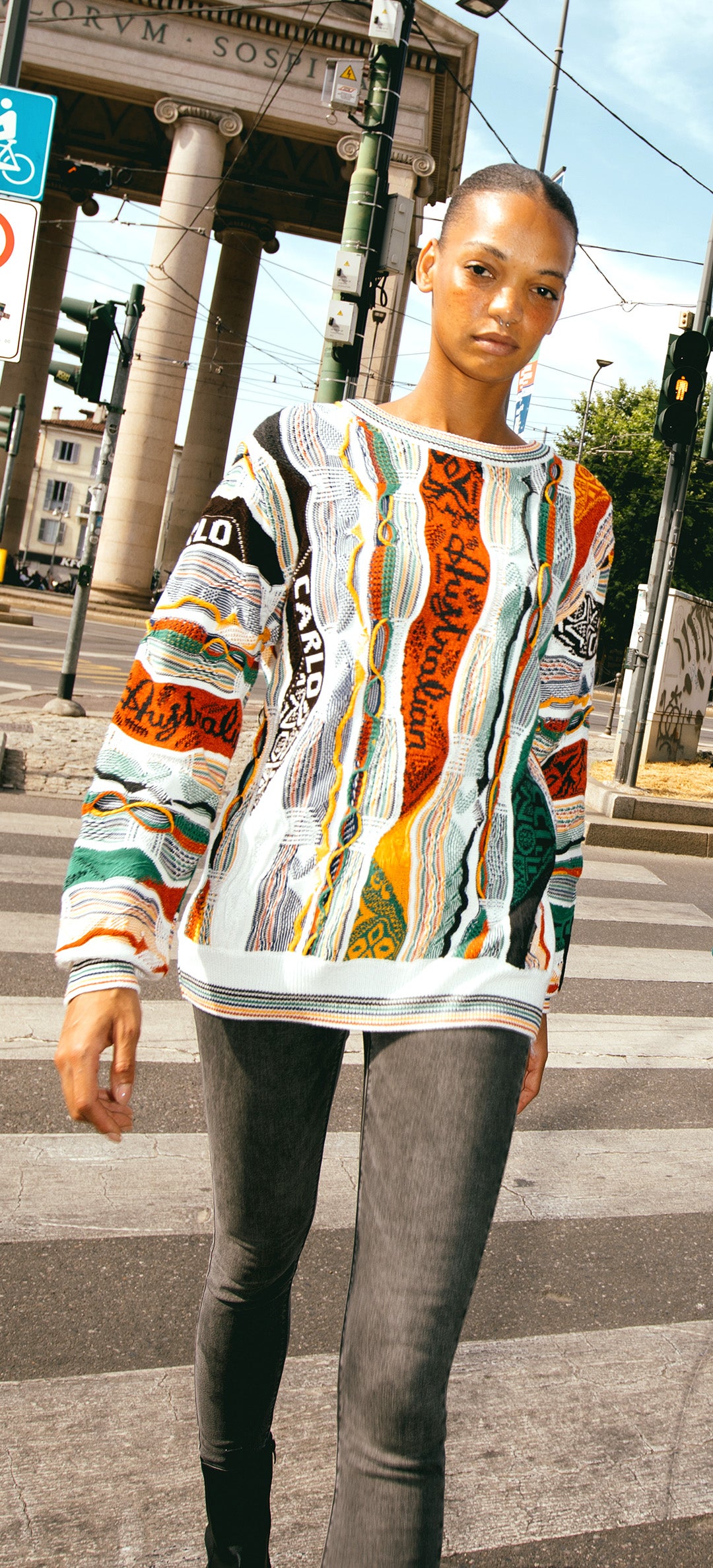 Protagonista assoluto della collezione è l’iconico maglione Carlo Colucci, realizzato con lavorazione jacquard tridimensionale. Colori vibranti, texture profonde e cura artigianale 100% Made in Italy: un omaggio alla storia del knitwear, pensato per chi non passa inosservato.